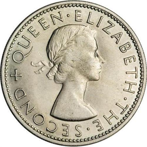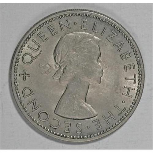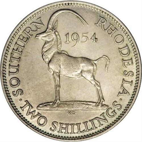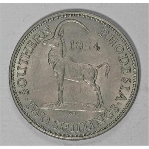 <B>Elizabeth II nickel 2 Shillings 1954,</B></I> KM-30, springbok, rare one-year type (how sad that this beautiful design left us so long ago), Uncirculated, soft strike on the portrait center, dull luster and a few small marks, but essentially choice for this issue.<B></B></I><BR><I>From the Robert Sayre Collection.</B></I><BR><BR><b>Shipping:</b> Coins & Currency (<a target="_blank" href="http://www.heritageauctions.com/common/shipping.php">view shipping information</a>)