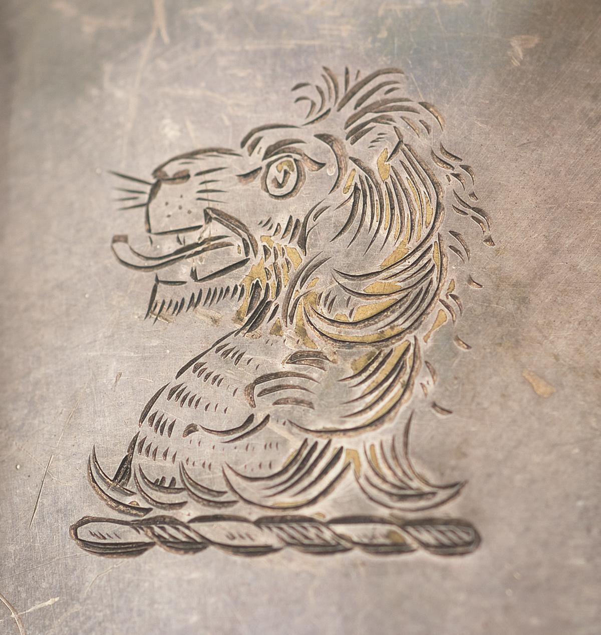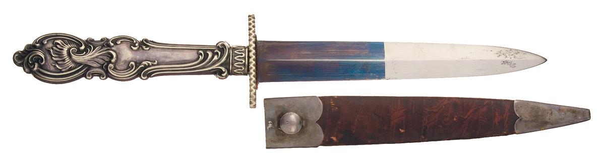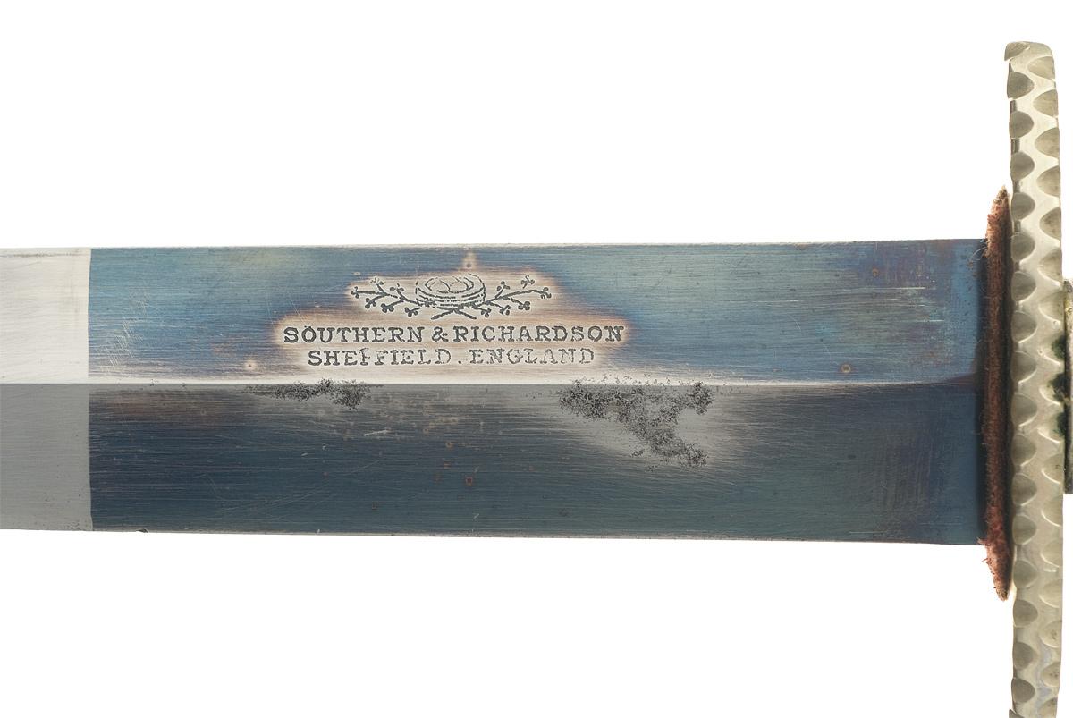 Double edged spear point blade, measuring 6 3/4", with a niter blue finish on the lower half and "SOUTHERN & RICHARDSON / SHEFFIELD ENGLAND" stamped on one side. German silver crossguard, with the grip made of sterling silver featuring a raised ornamental scroll pattern. With leather sheath with silver tip and throat and masterfully engraved lion head on the bolster.