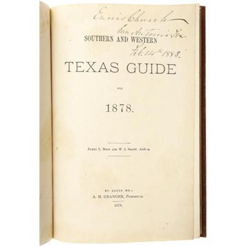 <B>James L. Rock and W.I. Smith: </B></I><B><I>Southern and Western Texas Guide for 1878.</B></I></B></I> (St. Louis, MO.: A.H. Granger, Publisher, 1878). First edition. Octavo (8.5" x 5.5"). 282 pages. Frontispiece portrait of Col. Thomas W. Pierce, the dedicatee. Illustrations in the text, and with the large folding color map at the rear (25" x 19"), map is two-sided, with Texas on one side and the U.S. and Texas on the other. Publisher's orange pebble-grain cloth with a double rule border stamped in blind on the covers, and lettered and decoratively stamped in gilt on the front cover and spine. Chocolate-brown coated endpapers. Very light general shelfwear and other very minor blemishes to the boards, previous owner's signature on the front pastedown endpaper and on the title. A very good, clean and crisp copy.<BR><BR><b>Shipping:</b> Books & Catalogs (<a target="_blank" href="http://www.heritageauctions.com/common/shipping.php">view shipping information</a>)