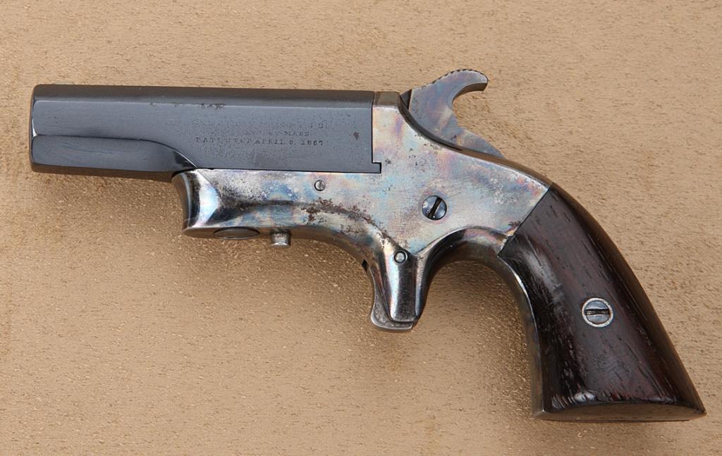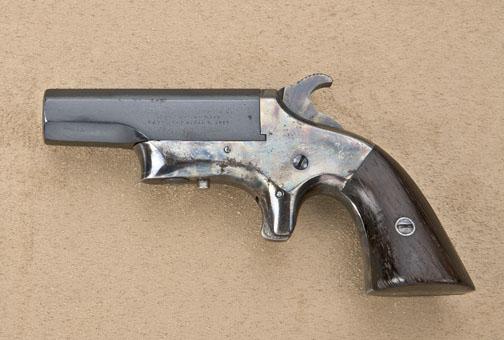 “Southerner” derringer with iron frame, showing old reblued and recase-hardened finish, rosewood grips, serial #4042. The Southerner marking on barrel has been recut, the address and patent dates half visible onbreech. The grips are fair to good and show some weathering, aging. Action is tight, bore slightly rough. Est: $350 - $550