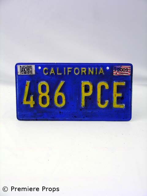 Two blue w/ yellow writing fake California license plates stuck together back to back. One side clean the other side has fake tags and splattered w/ fake blood (approx. 12" x 6" x 0.5")