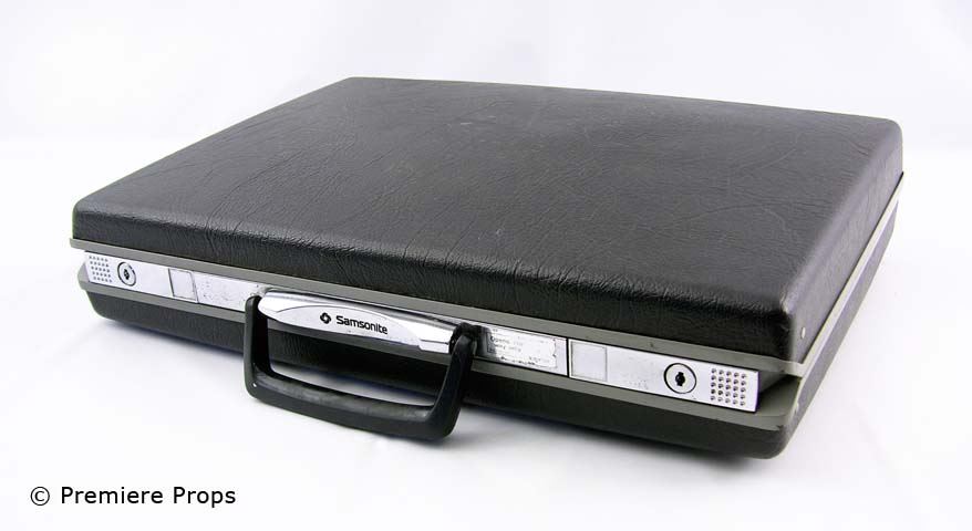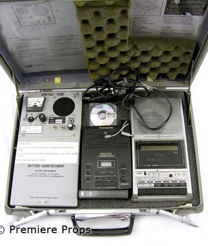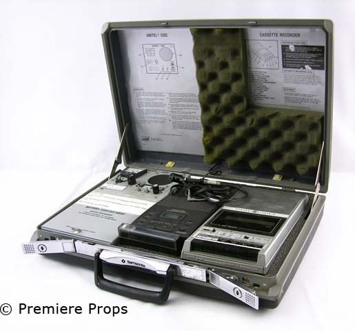 UPU Phone Tapping Surveillance Briefcase - black "Samsonite" briefcase contains a "Unitel 132C", a recorder, a digital messaging system, a disc, and a tape / none of the devices are functional (~ 13.5" x 18" x 4") (screen used)