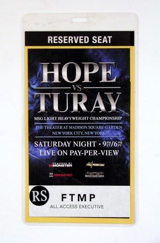 Madison Square Garden Hope vs. Turay Light Heavyweight Championship Fight FTMP 'All Access Executive' pass. (approx. 7 1/2" x 4 1/2") Condition and sticker may vary.
