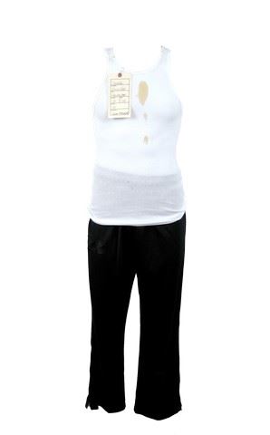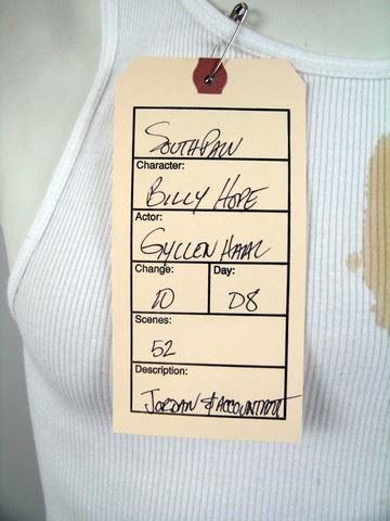 Billy Hope (Jake Gyllenhaal) screen worn, hero, stained on the front white 'Hanes' ribbed cotton tank top, (size XL) and black with grey stripe 'Under Armor' sweat pants. (size L) Includes wardrobe tag.
