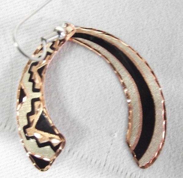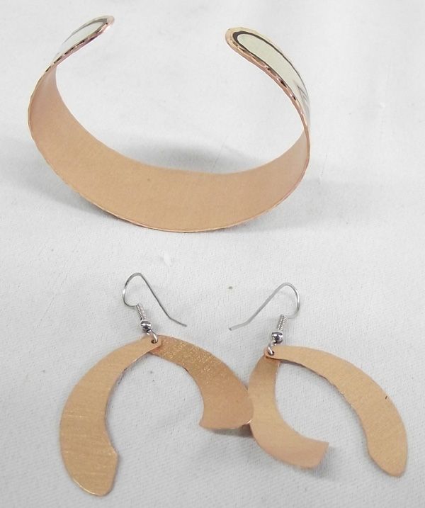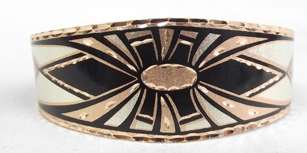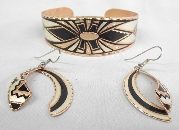 Southwest Copper Bracelet and Matching Earrings. Sparkling set of copper with enamel overlay and etching in southwest style design. The bracelet is 7'' inside including the opening and 7/8'' wide. The earrings hang on loops and are 2-1/8'' long.