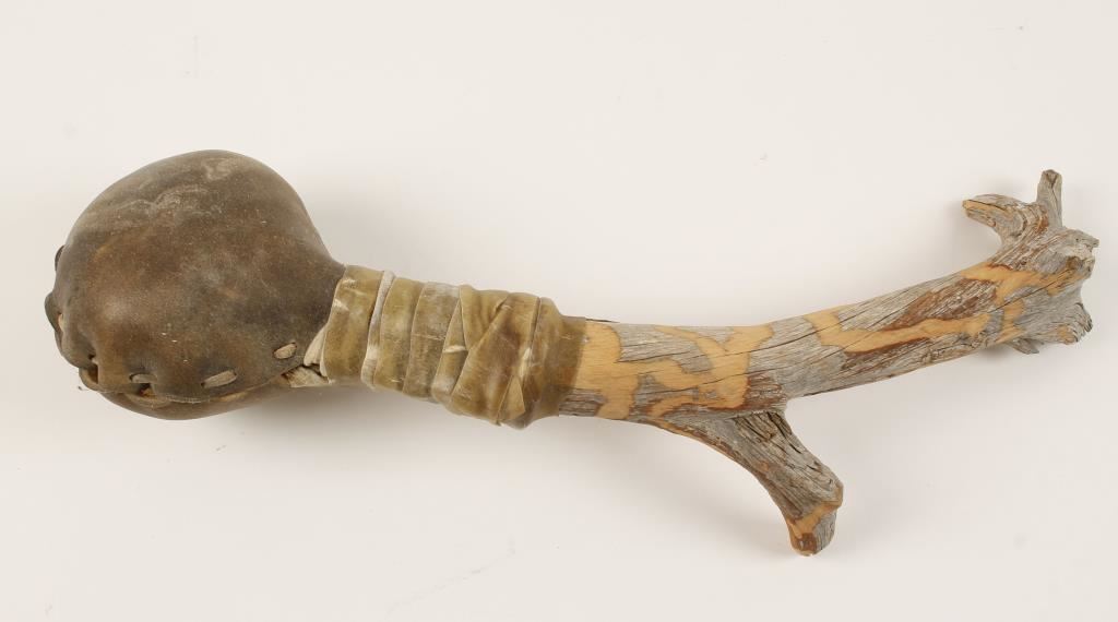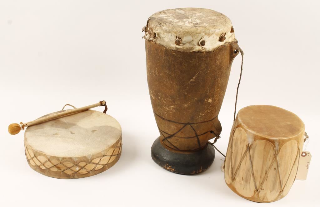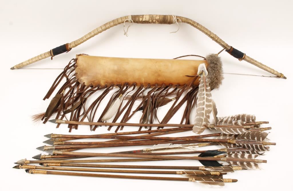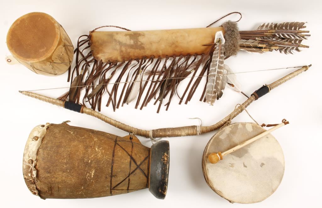 Including Indian wooden bow wrapped over in rawhide natural leather and an Indian arrow quiver made of rawhide with natural leather strips with thirteen indian made arrows. Two southwestern American Indian tribal ceremony drums with wooden drum stick. Original Native American Indian Ceremonial drum made from a hollowed tree stump and wrapped in rawhide with a ceremonial medicine man 'shaker' made from a gourd, small pea stones and an old tree root.