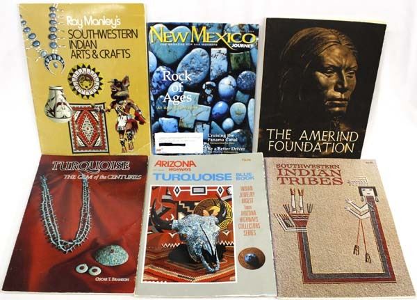 Southwest Interest Magazines and Softback Books, includes 1. New Mexico Journey Rock of Ages All about Turquoise (Magazine) March/April 2004 2. Turquoise: The Gem of the Centuries by Oscar T. Branson, c. 1975 First Edition 3. Arizona Highways Turquoise Blue Book c. 1975 4. Ray Manley's Southwestern Indian Arts & Crafts 5. Southwestern Indian Tribes by Tom Bahti, c. 1975 Fifth Printing 6. The Amerind Foundation c. 1967, signed by Rose Hayden Fulton