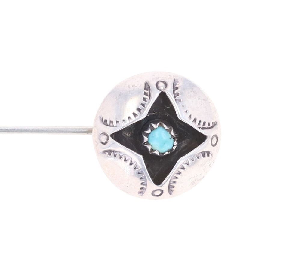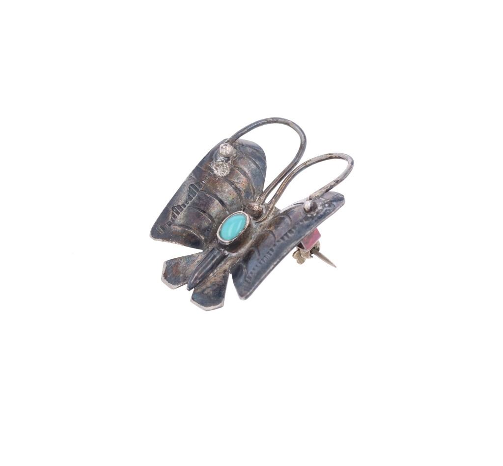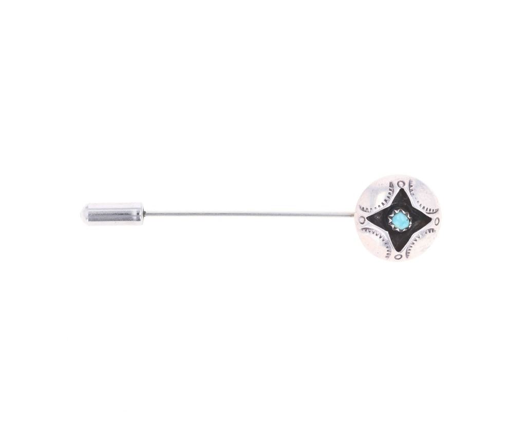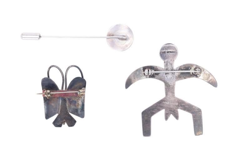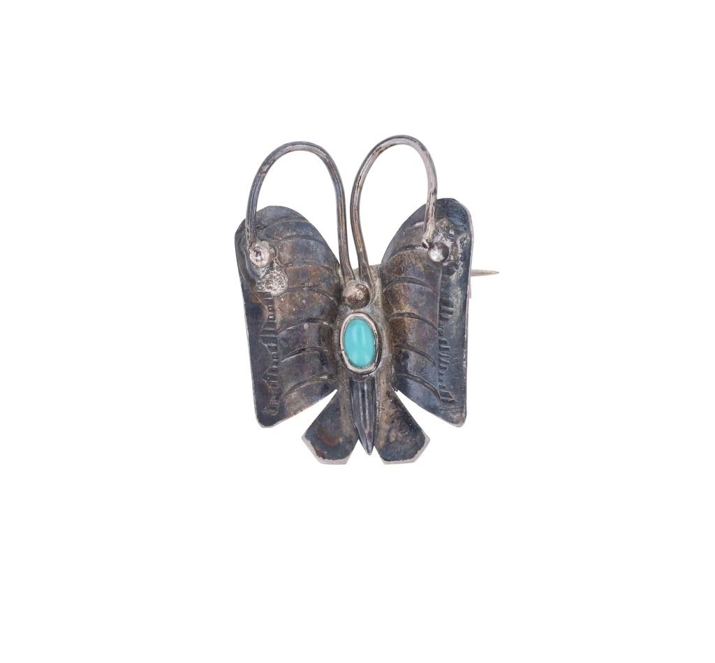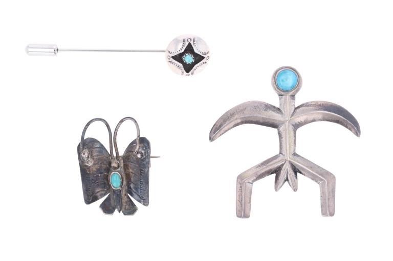 Featured in this lot is this Southwest and Navajo sterling silver pins and brooches. There are three pins or brooches in this collection with the first being a butterfly design with a silver frame and a oval cut turquoise cabochon set into the center. The second is a pock brooch with a sterling silver rod and a shadowbox design as the head with a round turquoise cabochon set into the center. The last is a cast sterling silver design with a round turquoise cabochon set into the head and marked as follows: Pine Springs. The condition of this collection of pins or brooches is good with no obvious signs of damage and shows good overall condition. The measurements of this collection ranges from 2 1/2" x 5/8" to 2" x 2". The collective weight of this collection of pins and brooches is 20g.