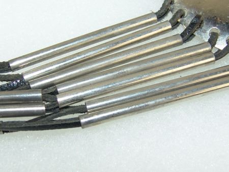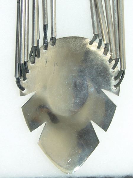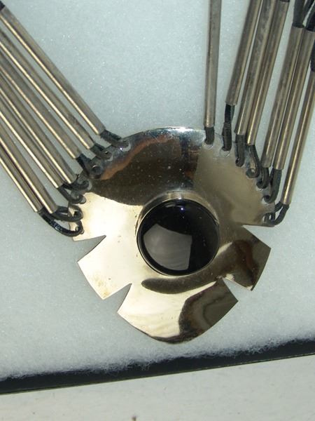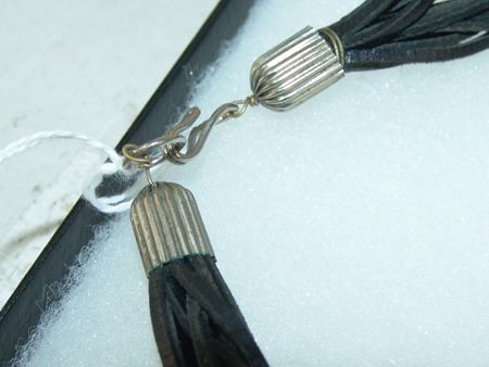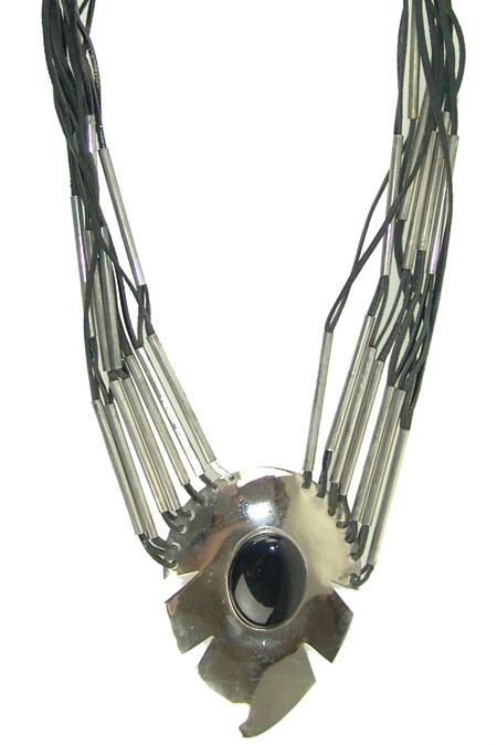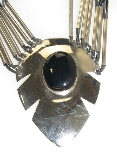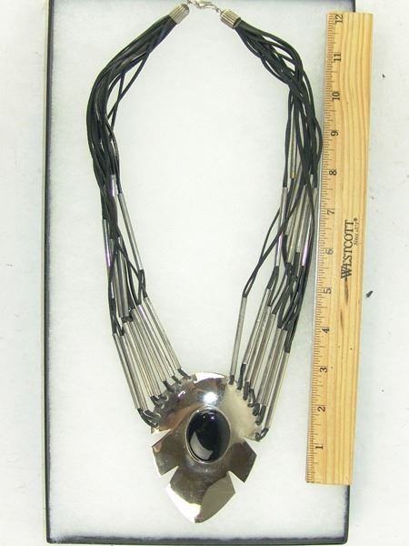 Ca. 1980s, Original style contemporary necklace with nickel silver pendant and tube beads strung on leather thong, the pendant with a large oval jet stone. Very good condition. 22" long, pendant 4-1/4" x 3"