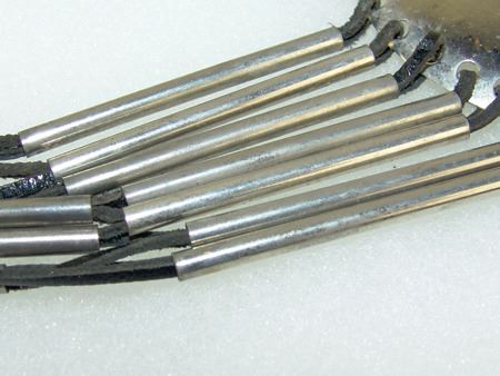 Ca. 1980s, Original style contemporary necklace with nickel silver pendant and tube beads strung on leather thong, the pendant with a large oval jet stone. Very good condition. 22" long, pendant 4-1/4" x 3"