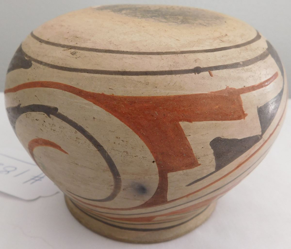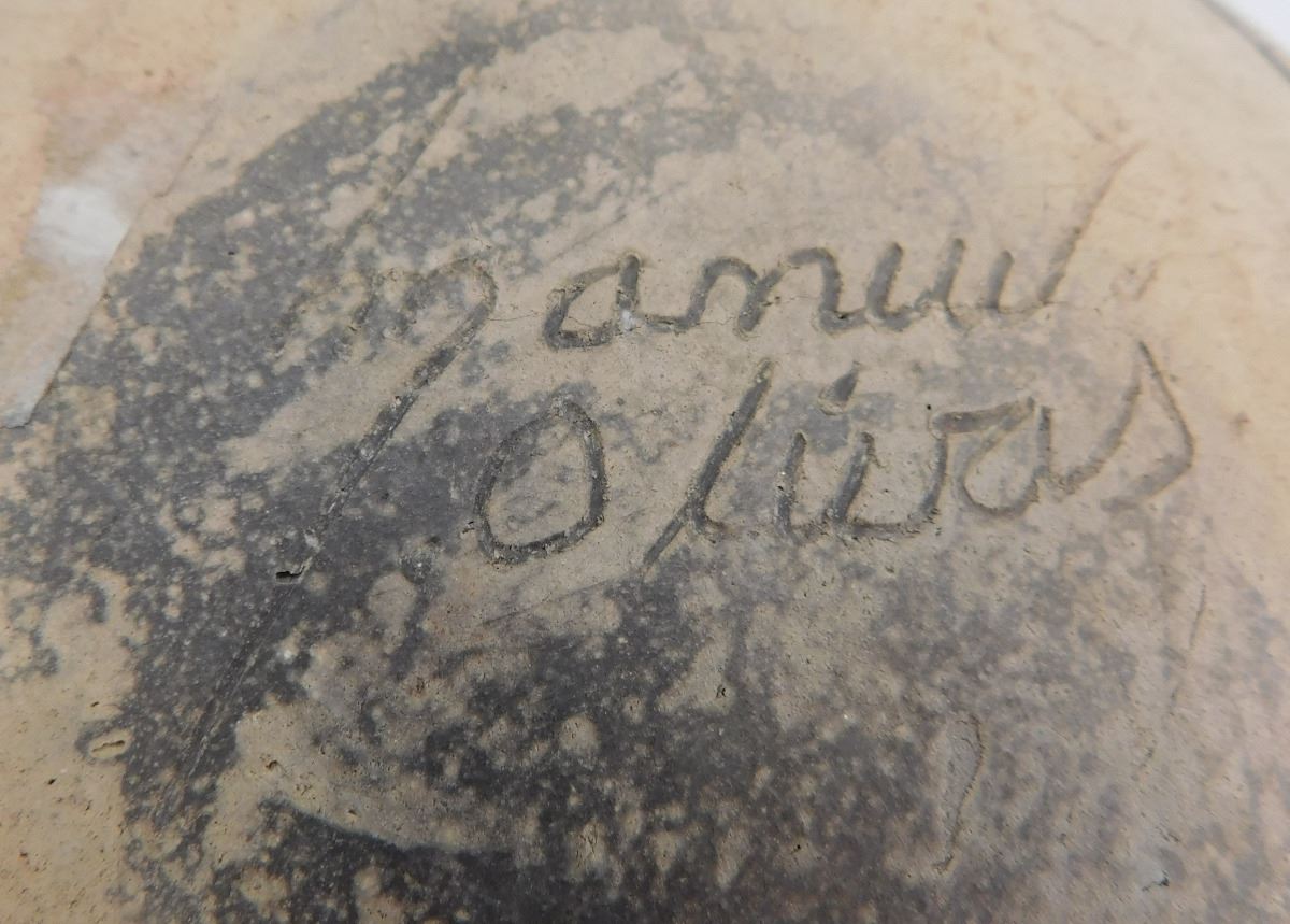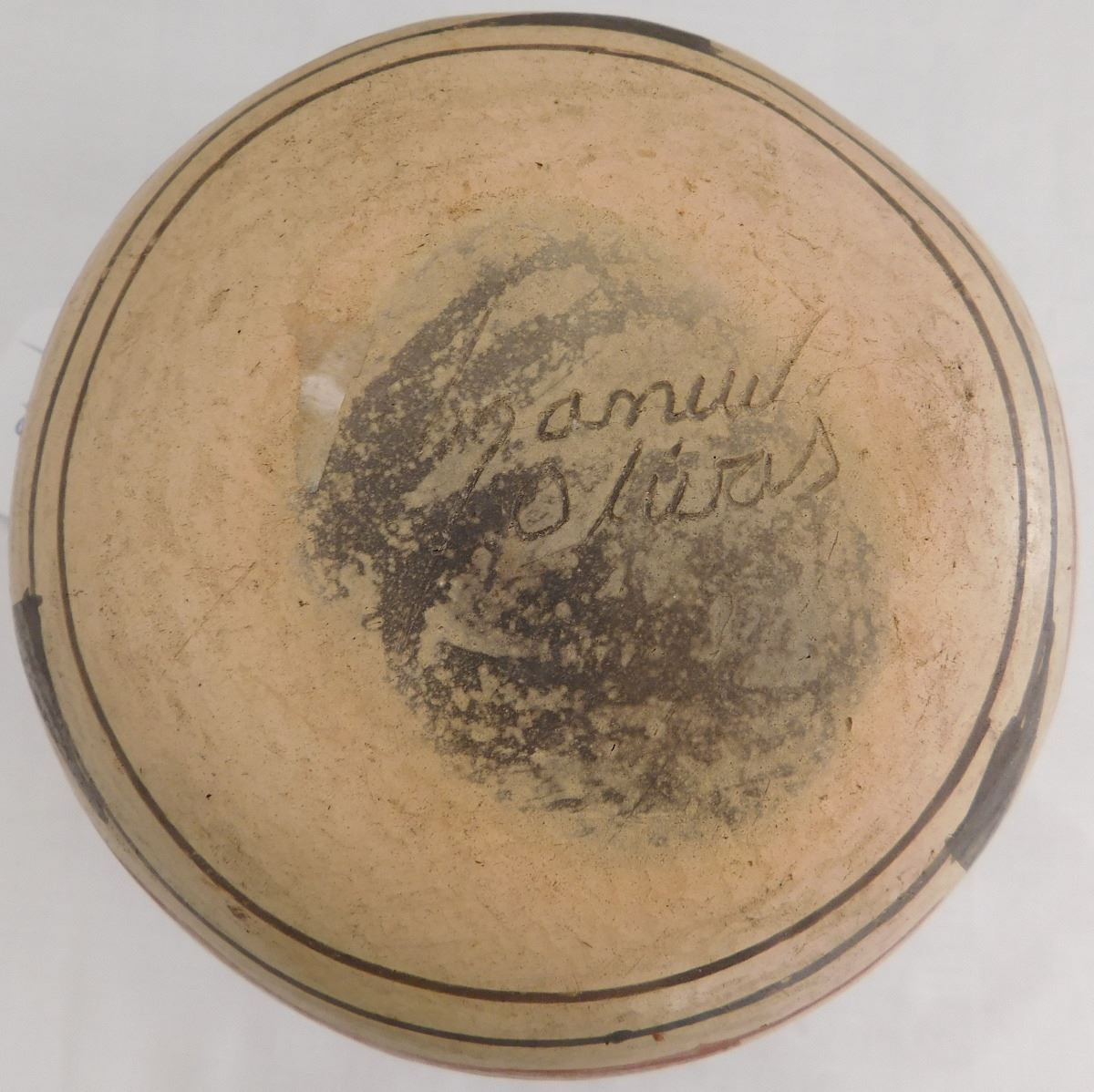 Southwest Pot, 20th century item. Made of clay and paint, this item measures 4.5" x 5". Rio Grande, Mata Ortiz. Casas Grande-style, signed Manuel Olivas. Condition: Good, see images. Shipping: $26.50, requires double-box.