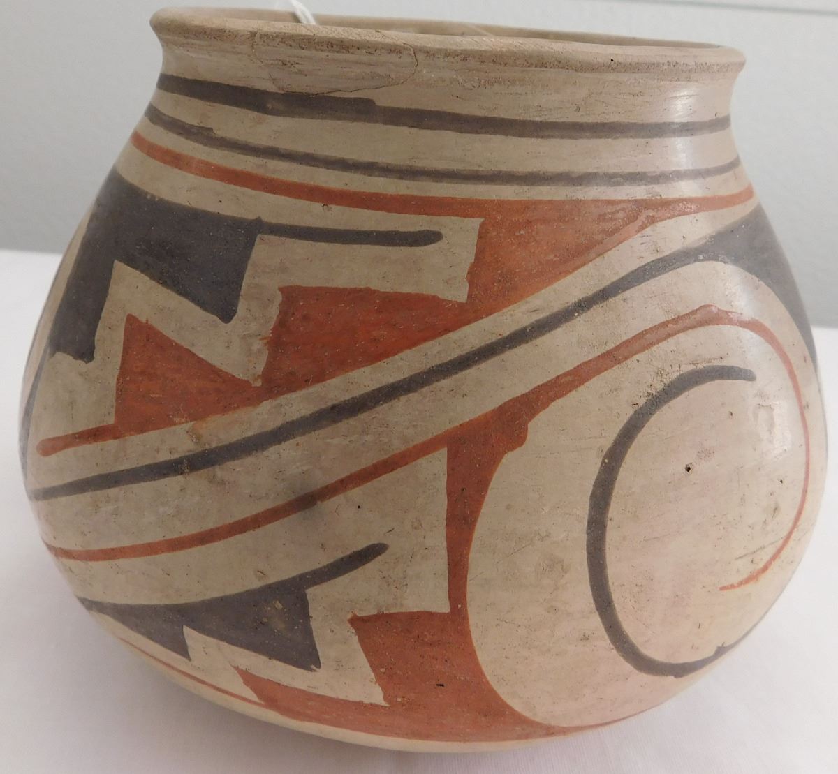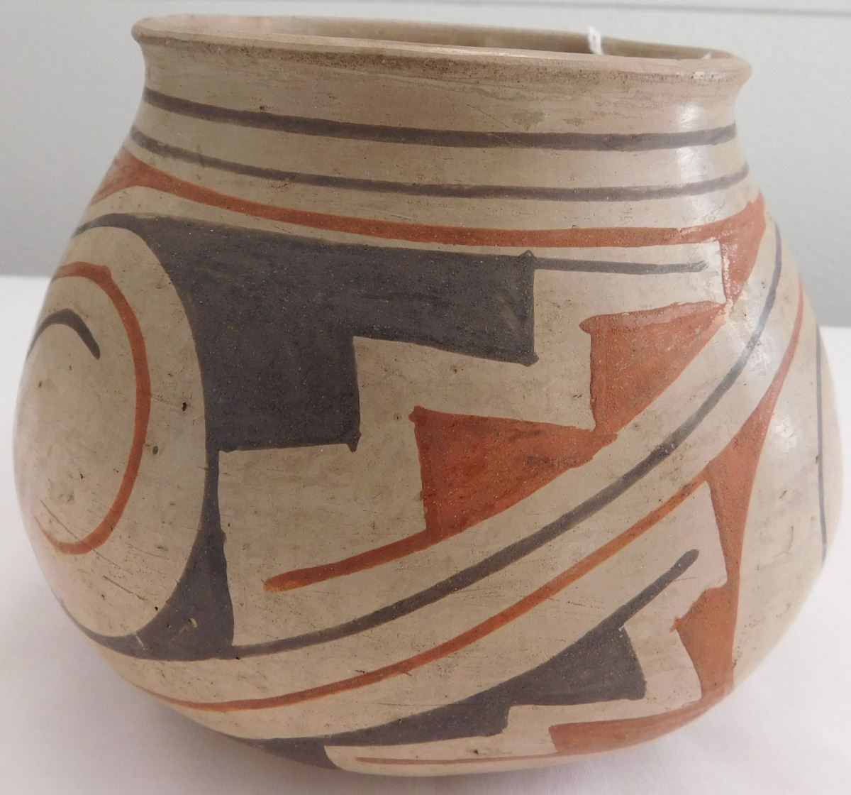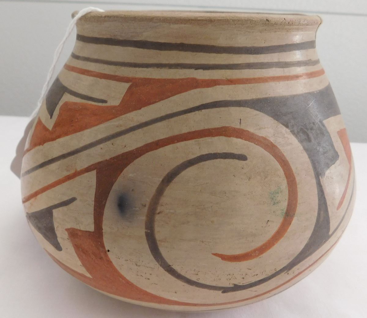 Southwest Pot, 20th century item. Made of clay and paint, this item measures 4.5" x 5". Rio Grande, Mata Ortiz. Casas Grande-style, signed Manuel Olivas. Condition: Good, see images. Shipping: $26.50, requires double-box.