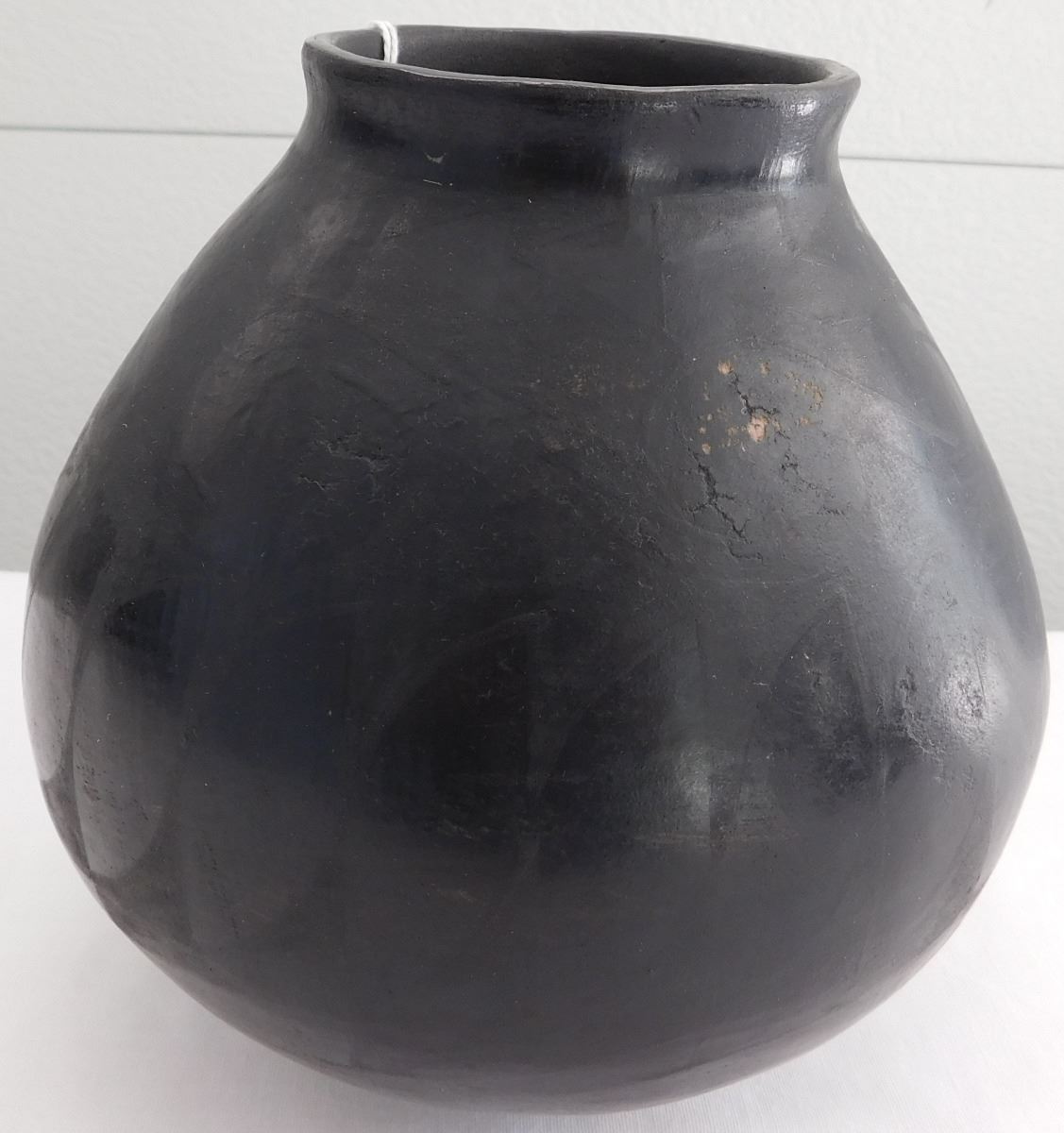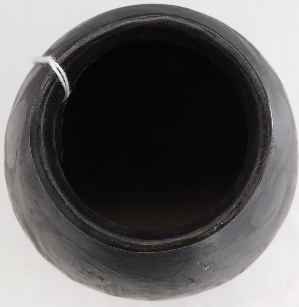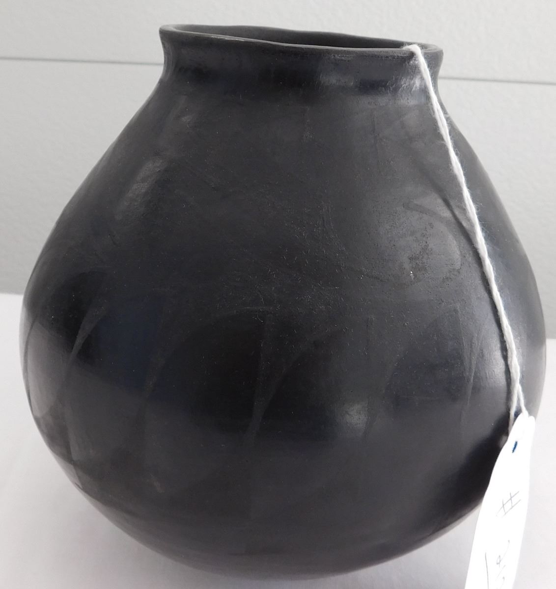 Southwest pot, 20th century item. Made of clay and paint, this item measures 6.5" x 6". Rio Grande, Mata Ortiz. Black on black pot. Condition: Minor paint loss, see images. Shipping: $26.50, requires double box.