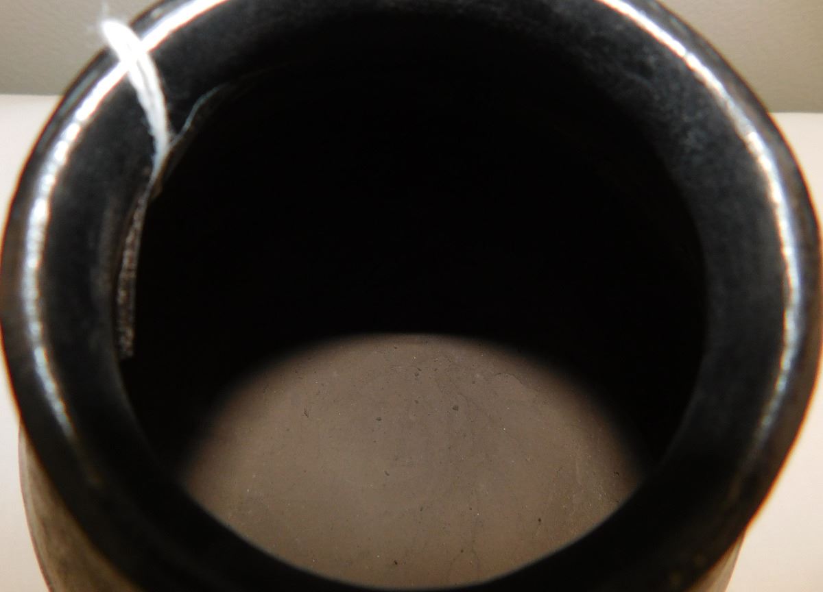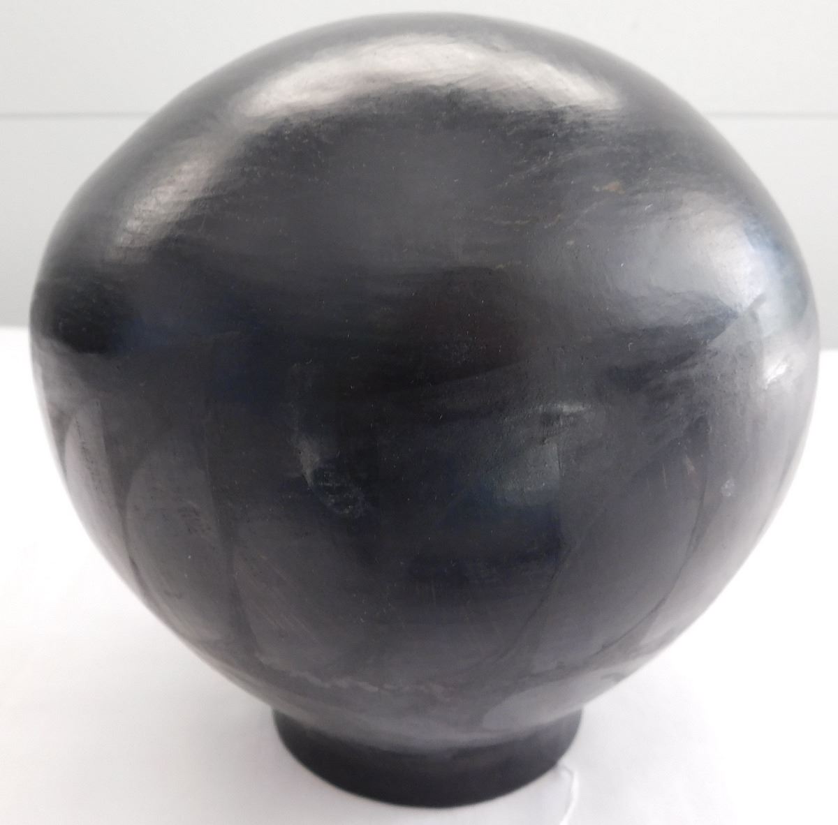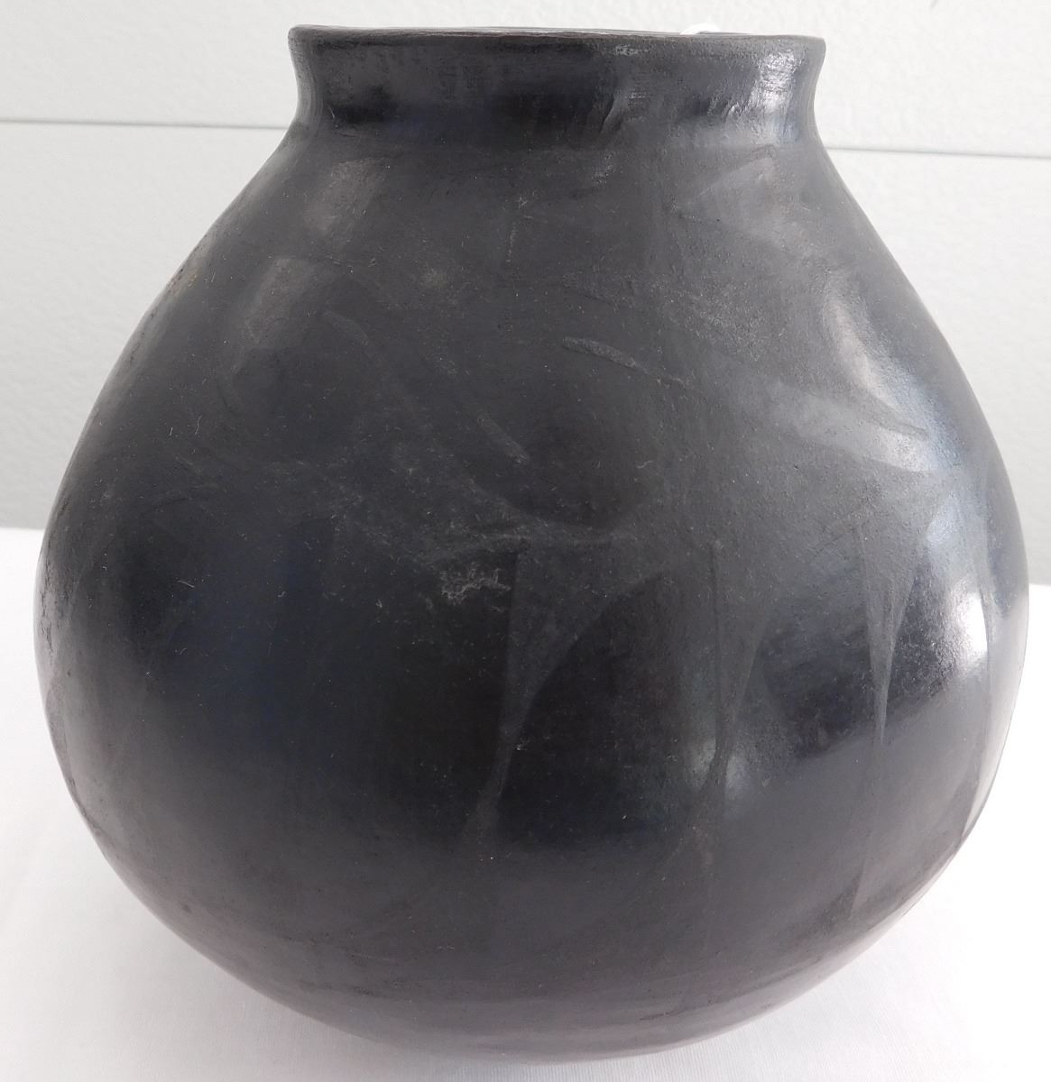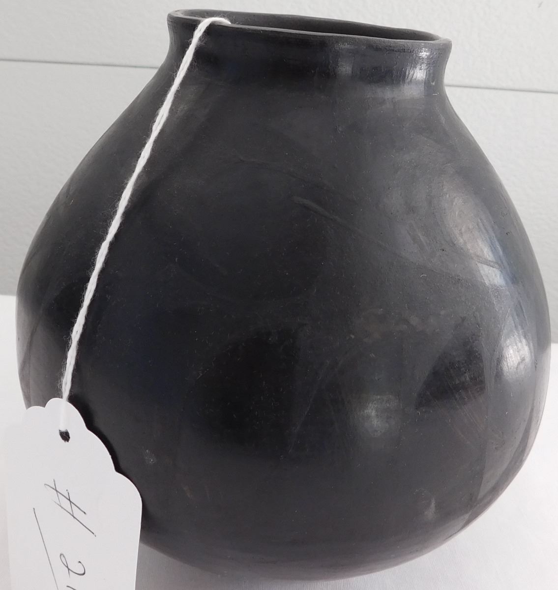 Southwest pot, 20th century item. Made of clay and paint, this item measures 6.5" x 6". Rio Grande, Mata Ortiz. Black on black pot. Condition: Minor paint loss, see images. Shipping: $26.50, requires double box.