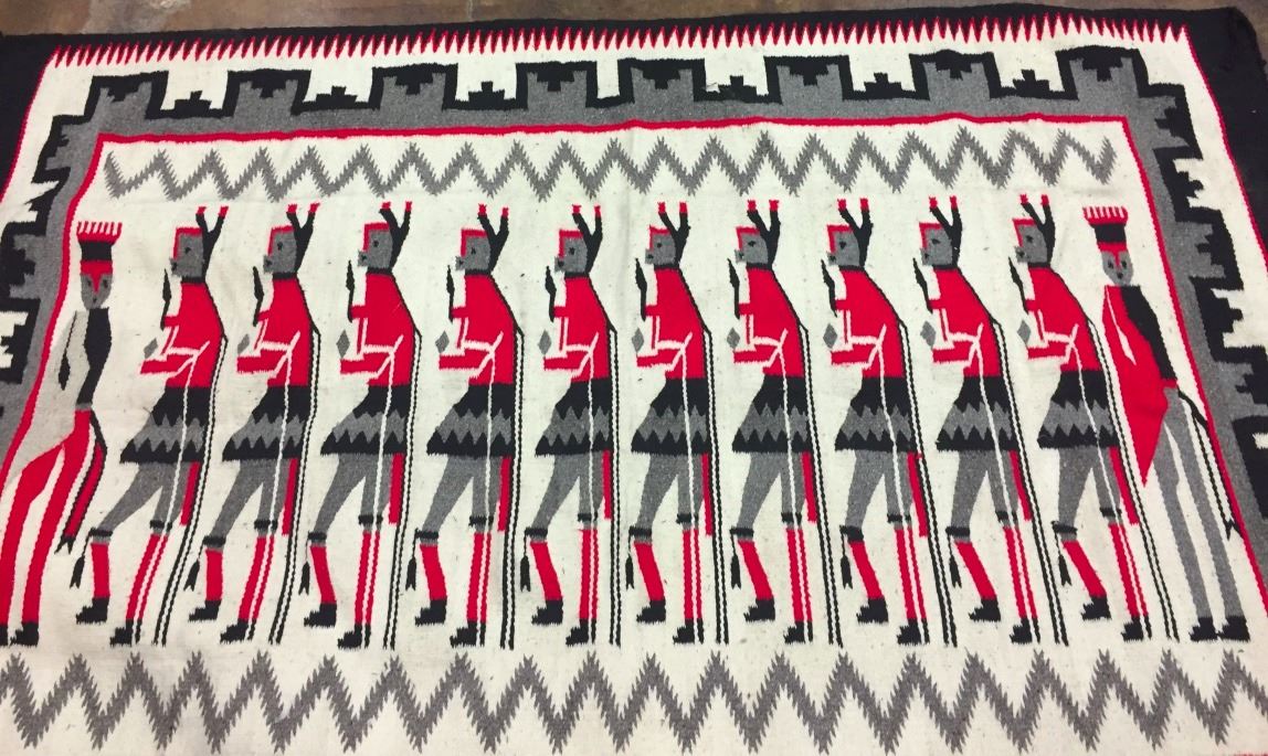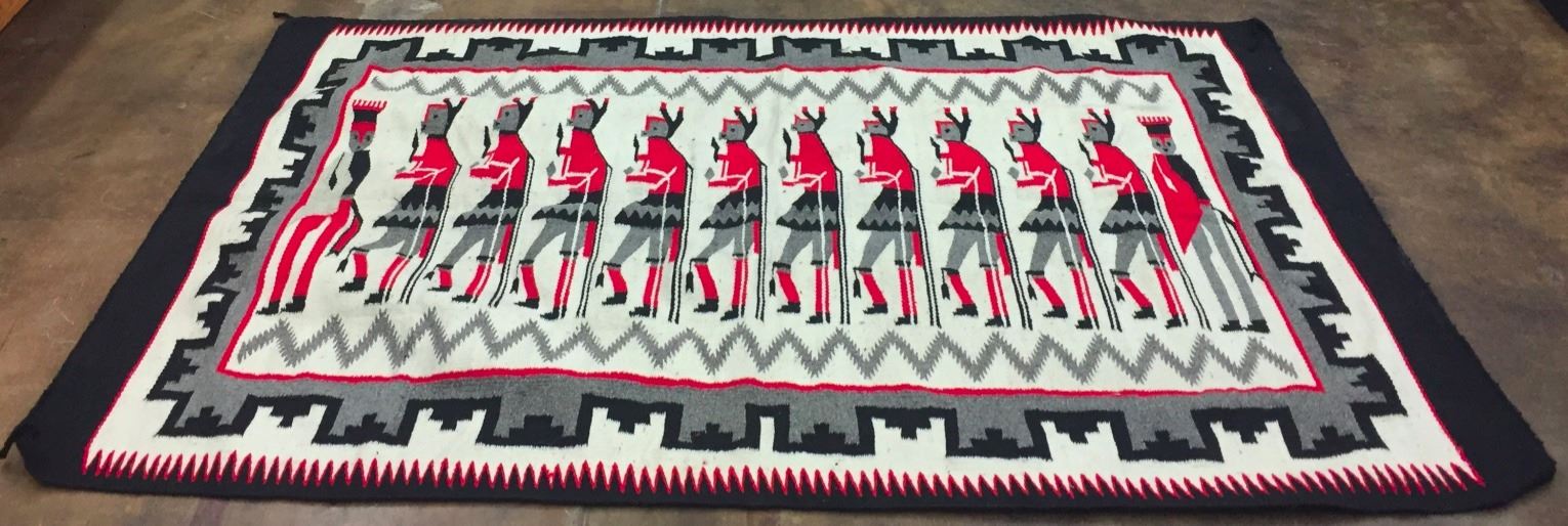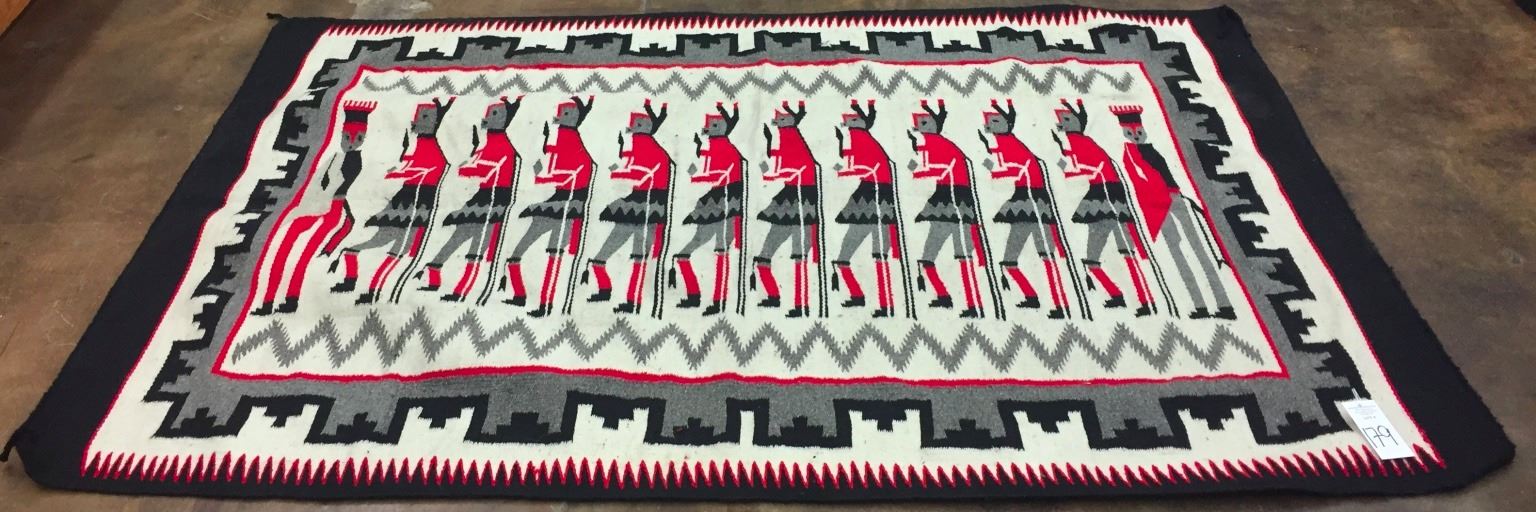 Maker: Unknown, most likely Mexican. Approx. Age: Vintage. Size: 55” X 82”. Condition: Good, Additional Info: Yei pattern, Southwest style textile. Please look closely at the pictures - they are an important part of our description. Shipping: There will be a $7 handling / packaging fee for shipping this lot. The actual cost of postage will be added on top of that.