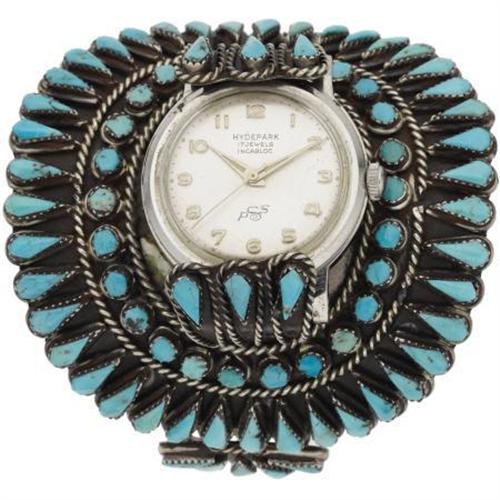 <B>Southwest Turquoise, Silver Cuff, Zuni with Hydepark Watch Head</B></I><BR><BR>The cuff bracelet features pear and round-shaped turquoise cabochons, bezel set in silver. Atop the cuff bracelet is a stainless steel, automatic Hydepark watch head featuring 17 jewels. Gross weight 92.70 grams. <BR><I>Dimensions: 6-1/2 inches x 2-3/4 inches</B></I> <B>Condition Report:</B> Good condition.<BR>Silver is tarnished on cuff bracelet.<BR>The watch head has been glued on top of the bracelet.<BR><BR><b>Shipping:</b> Miscellaneous Collectibles, Smal (<a target="_blank" href="http://www.heritageauctions.com/common/shipping.php">view shipping information</a>)
