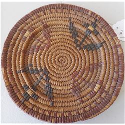 Hopi Figured Coil Basket. Circa 1940s. Made of grass. Measures 7.5" x 7.5" x 1". From North-Central Arizona, Hopi. Features 4 deer-li...