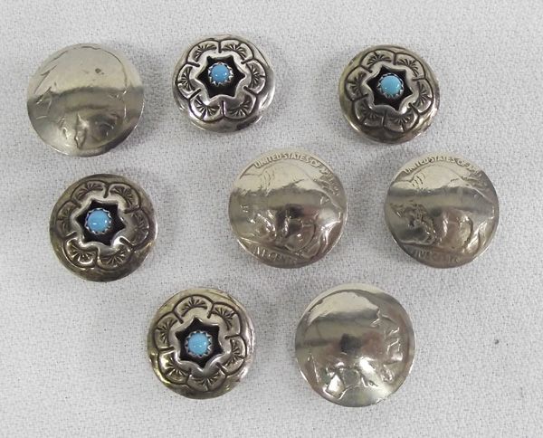 8 Southwestern Button Covers, each hand stamped with turquoise colored cabochon, each measures .75''D