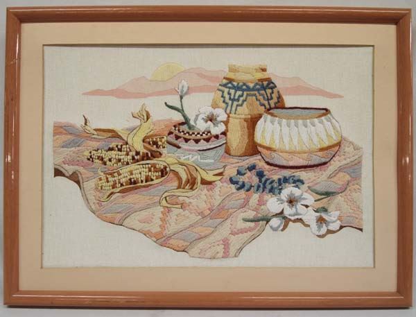 Southwestern Crewel Framed and Matted Picture, visual measures 11.5''W x 17.5''L, Native American subject matter