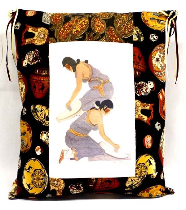 Southwestern Designed Pillow, has 2 Ribbon Tassels, measures 15''L x 12''W, the center of the pillow has a Gerald Nailor (Native American Navajo) picture transferred onto material ''Corn Grinders'' c. 2006