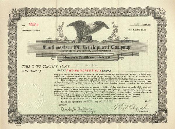 1919. Stock certificate for 250 shares. Black on green background. Vignette of eagle at top center. Uncancelled. Very fine.