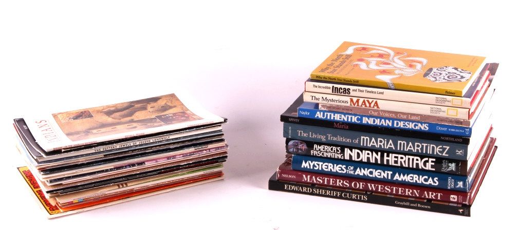 This lot includes numerous books and magazines of Southwestern influence. There are 11 books and 30 magazines, calendars, and coloring books. Several of the books are related to pottery, art, baskets, and rugs from different Native Americans such as the Navajo, Hopi, and others. All the books and magazines are in very good condition.