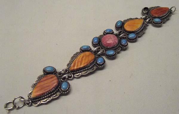 Southwestern Silver Red Shell Link Bracelet. 7'' end to end, 1'' widest part, stamped sterling. One turquoise stone missing. Buyers Pay Actual Shipping and Handling Charges(see terms and conditions for more information)