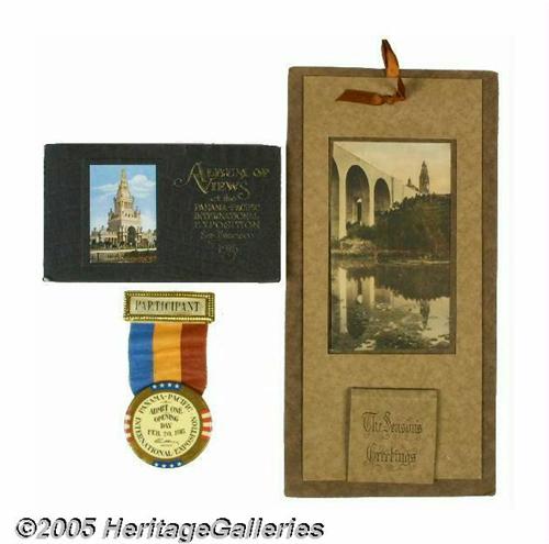 <B>Souvenir Lot from the 1915 Panama Pacific Exposition</B></I> This nice grouping of items for this expo features an opening date badge, Album of Views, an unusual calendar and nice grouping of letters and postcards. This exposition was originally to commemorate the opening of the Panama Canal, but after the earthquake of 1906 in San Francisco, the expo came to mean a lot more to that city by helping to rejuvenate it financially. This mixed bag of items gives excellent insight into the expo and shows how San Francisco rose out of the ashes of tragedy. Items in very good condition. Lot:254