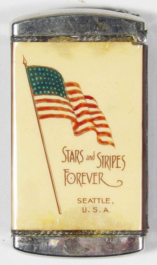 Souvenir Match Safe. Alaska Indian Totem Pole Seattle, and American flag. Some edge repair otherwise good condition. 1 1/2 X 2 3/4 inches.