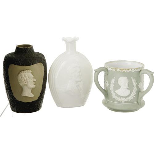 <B>Souvenir Pottery Depicting Abraham Lincoln</B></I> Displaying nicely, these three pieces of pottery, each with an impression of Lincoln exemplify our fascination with this great leader. Long after his assasination, items were still being made to commemorate his life and death. These examples are most probably from around 1910. Typical of the milkglass produced by Westmoreland, although unmarked, this decanter is embossed not only with Lincoln's bust but also with a scene from his log cabin days on the reverse. The piece presents in excellent condition standing 9" tall. A brown matte finish vase pictures Lincoln along with an eagle on the reverse. The piece is also 9" tall and excellent. Pottery which has the look and feel of Wedgewood was often used for this type of souvenir ware. This three-handled Wedgewood style knock-off commemorates Washington, Jefferson, and Lincoln with no clue of the maker on the bottom. In high relief, several of the embellished areas have retained light dirt, but the overall condition is very good with no evidence of chipping or cracking.<BR><BR><b>Shipping:</b> Miscellaneous Collectibles, Larg (<a target="_blank" href="http://www.heritageauctions.com/common/shipping.php">view shipping information</a>)