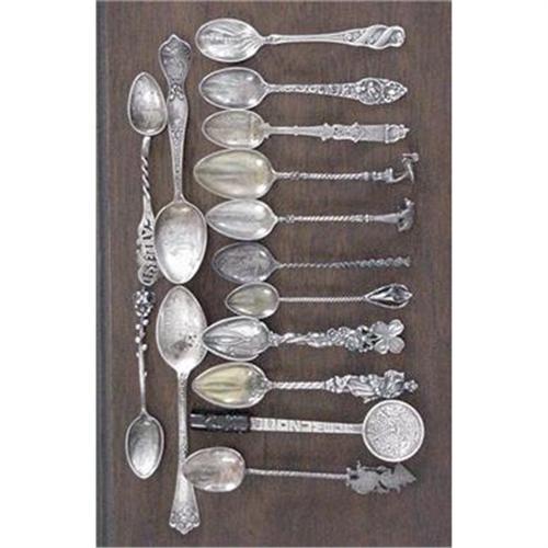15 antique spoons, the majority are sterling and several are marked 800. Each is engraved with a name of a town or depicts an activity or building, some have women's names engraved in the bowls and dates on the back of the spoon. They are all 19th century and a great find for a spoon collector. Condition of all is very good, a good polishing would really make them shine.