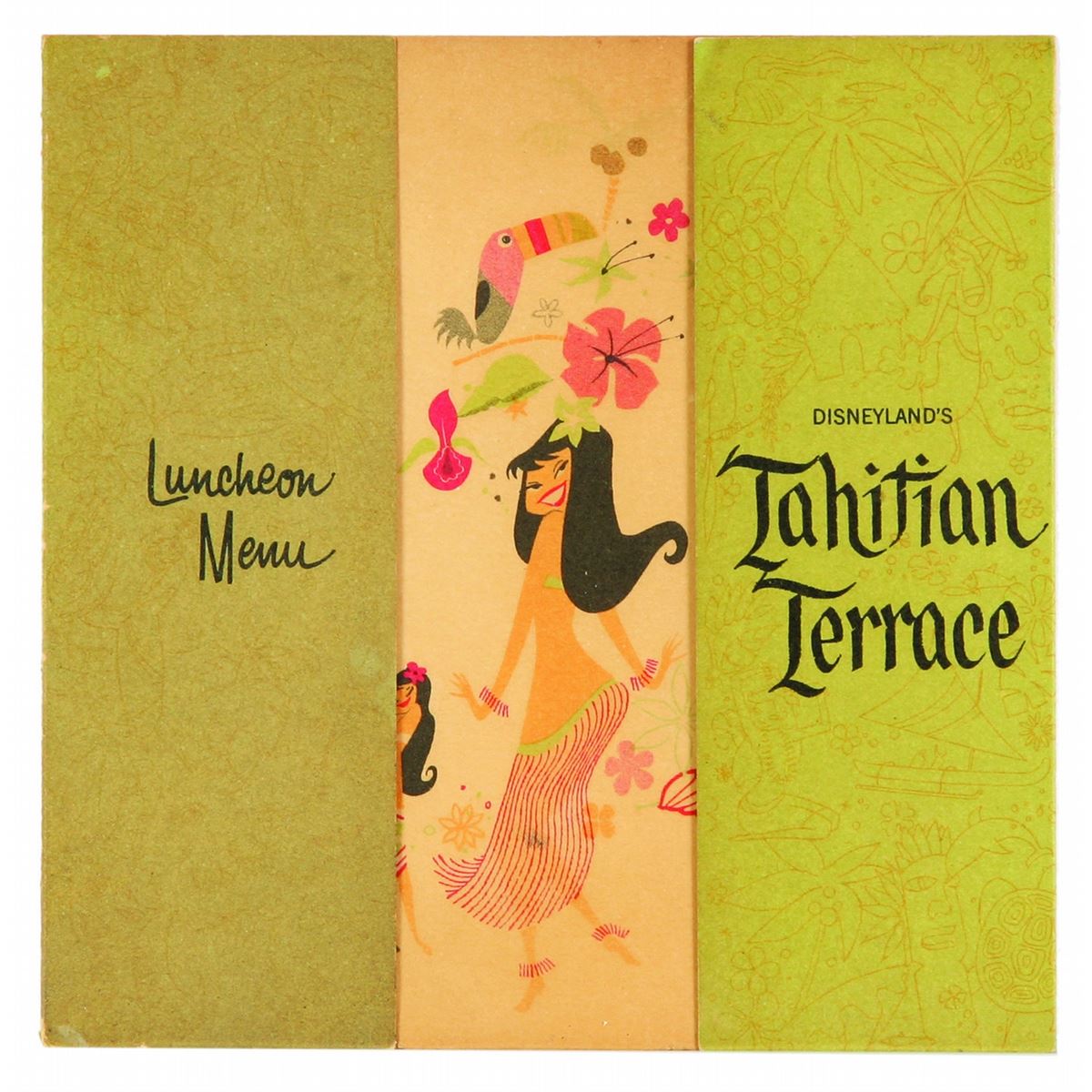 (Disneyland, 1960s) A charming souvenir luncheon menu from the Tahitian Terrace at Disneyland. Folds out to reveal stylized appealing imagery mixed in with the menu items. Measures 5”x5” folded, and 5”x8.5” unfolded. In good condition with discoloration from age causing a darkness to the paper. Small thumb-tack mark in top of menu.