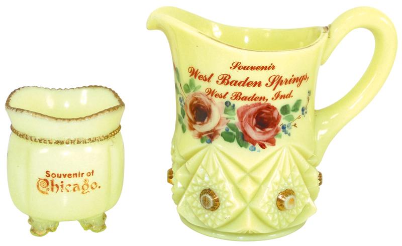 Souvenir custard glass pitcher from West Baden Springs-West Baden, Ind., diamond w/peg pattern decorated w/roses & gold, Exc cond w/some gold wear & toothpick holder from Chicago, Exc cond, 5" & 3"H.