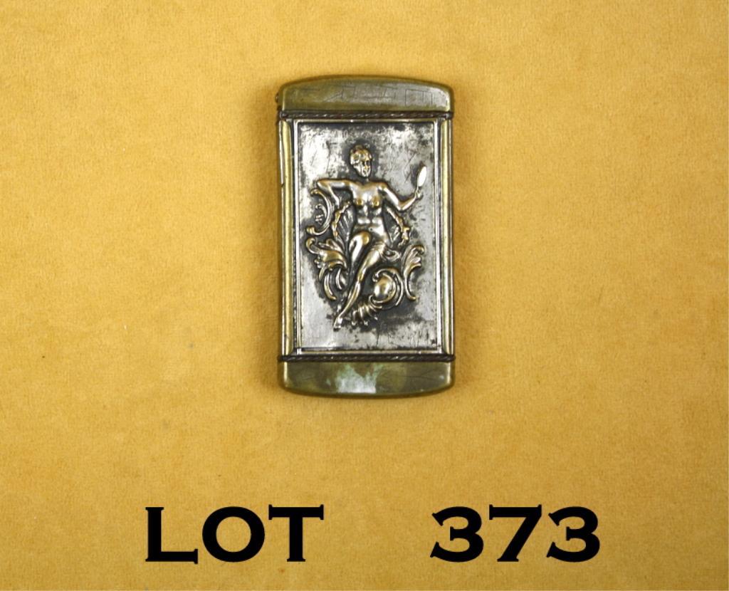 Souvenir nickel over brass match safe from the Pan-American Exposition in Buffalo, New York; one side of the safe is embossed with a reclining lady and the other side showing the Electric Tower at the entrance to the Exposition; in overall worn but complete condition with approx. 60% frosted nickel finish confined to the embossed panels with the balance worn to the brass body, approx. 3” x 1-1/2” in size. Est.: $50-$100.