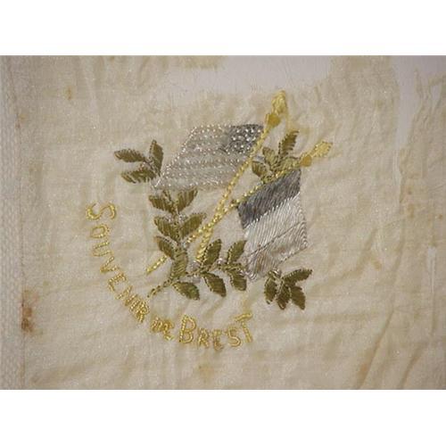 A framed handkerchief embroidered with the American & French flags over the words "Souvenir of Brest". Framed size is 16" X 17", the lace trimmed handkerchief is somewhat tattered. Brest France was the German submarine base in World War II, It was heavily bombed by the allies.