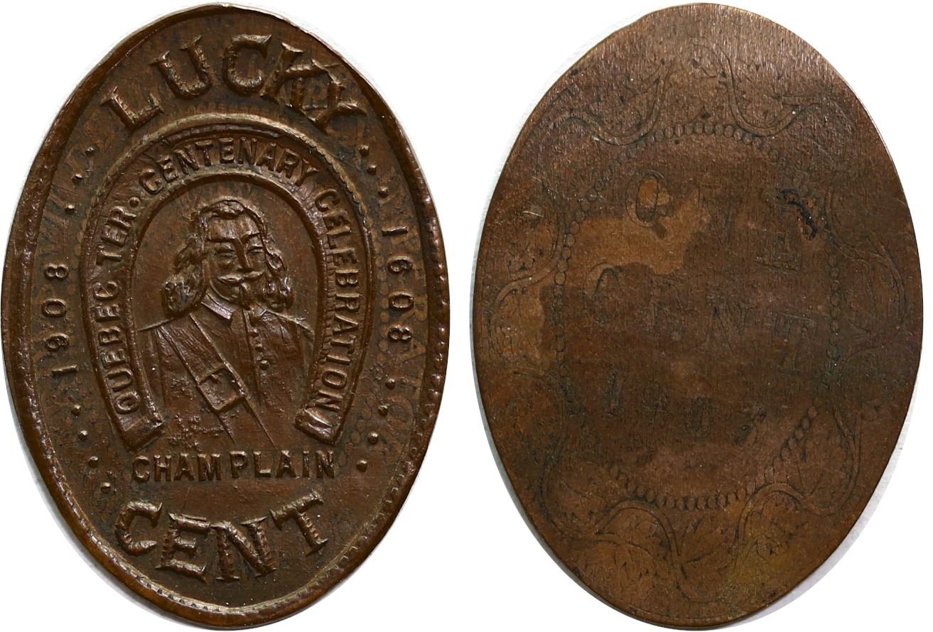 Souvenir token, Lucky cent from the 1908 Quebec tercenternary celebration struck on an elongated large cent 1903, virtually as struck with great details, Bowman 4010a. Scarce.