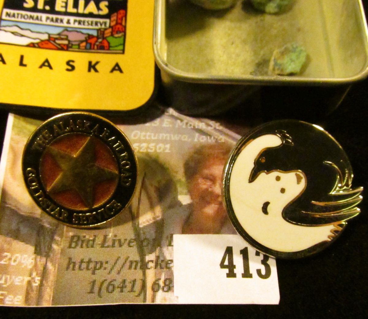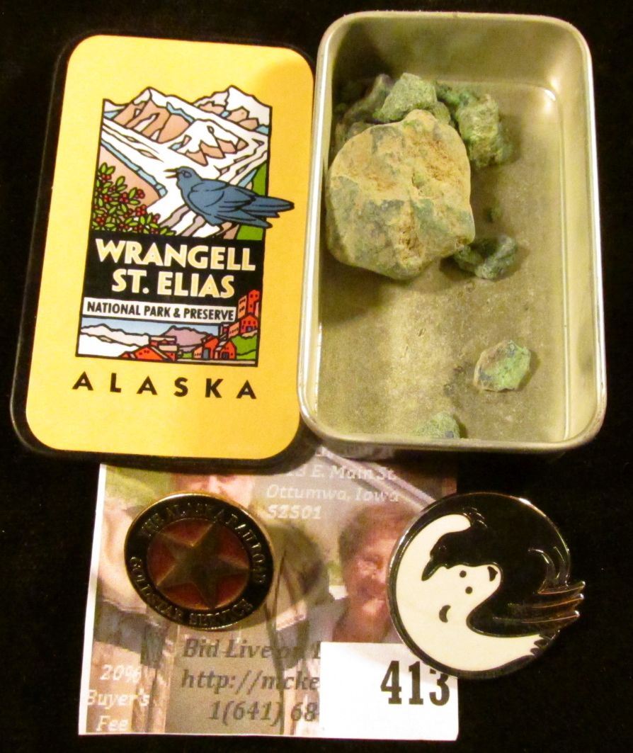Souvenirs from a trip to Alaska – a box from Wrangell St. Elias National Park, a GoldStar Service pin from Alaska Railways, and an Alaska Geographic Society pin