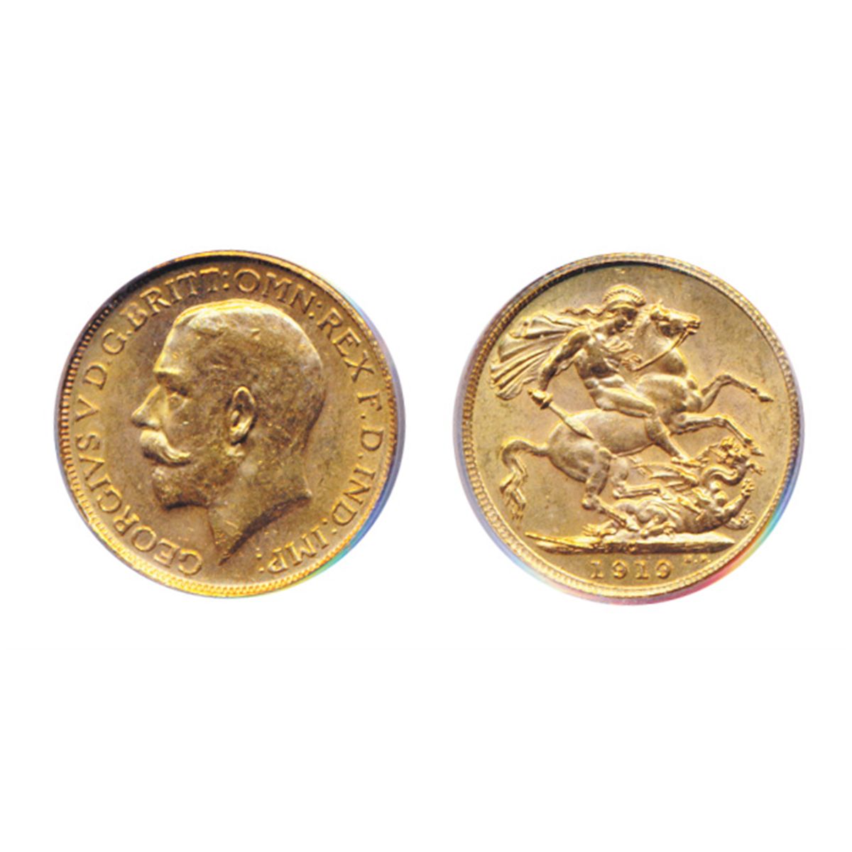 Sovereign. 1919-C. Both ICCS and PCGS graded Mint State-63. Brilliant golden luster.