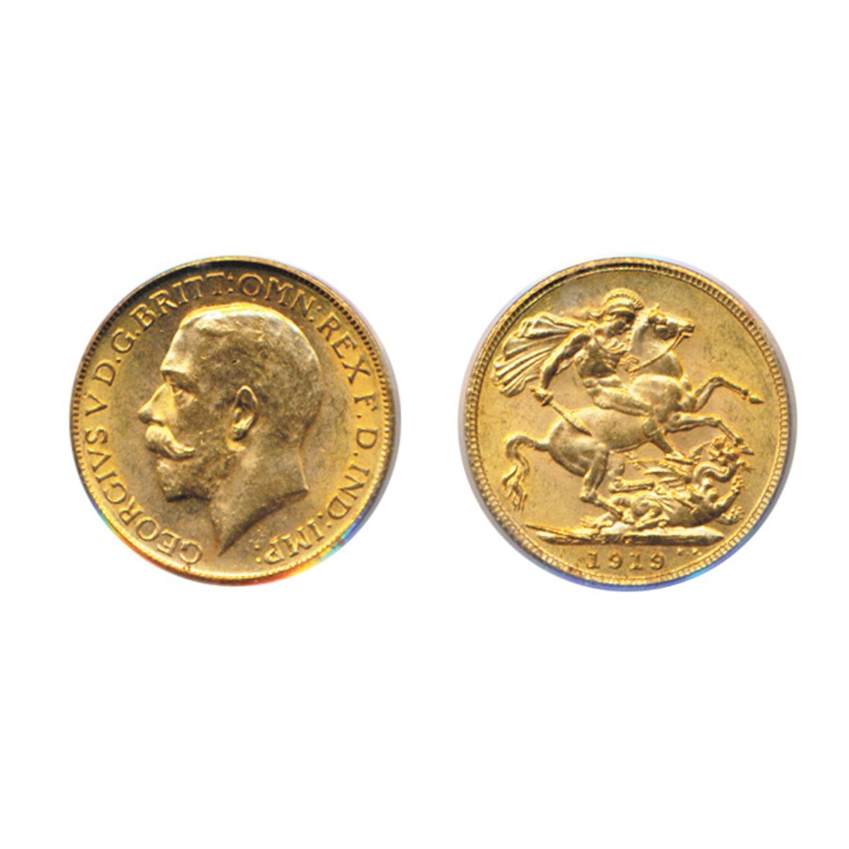 Sovereign. 1919-C. Both ICCS and PCGS graded Mint State-63. Brilliant golden luster.