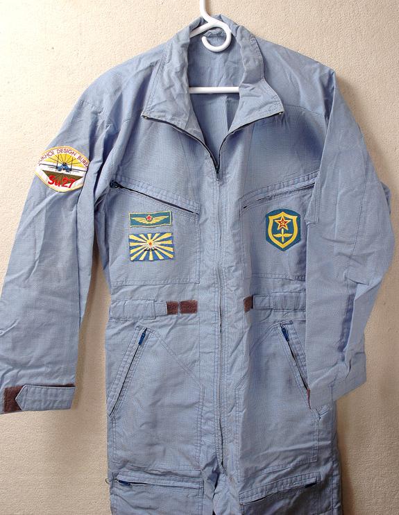 Soviet Air Force, Flight Suit. This light blue garment has a zipper front and velcro adjustments on the legs and sleeves. There are three Air Force patches on the chest and an English language Sukhoi Design Bureau / Su-27 patch on the right shulder. This suit was worn by cosmonaut Alexander Poleshchuk when on Air Force duty. Attractive.