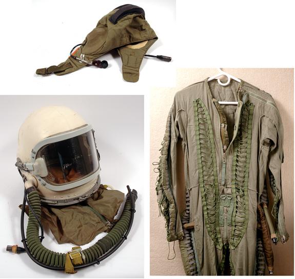 Soviet Gsh-6A Helmet and Partial Pressure Suit (VVK-6M). This green partial pressure suit was used by MIG-21 pilots to prevent their blood from rushing to their feet during high speed manoevers. The suit has three zippers on the front and one on the back (jammed). as well as numerous adjustment laces to ensure a snug fit. Two hoses extend from the waist of the suit which attach to the plane's pressure system.