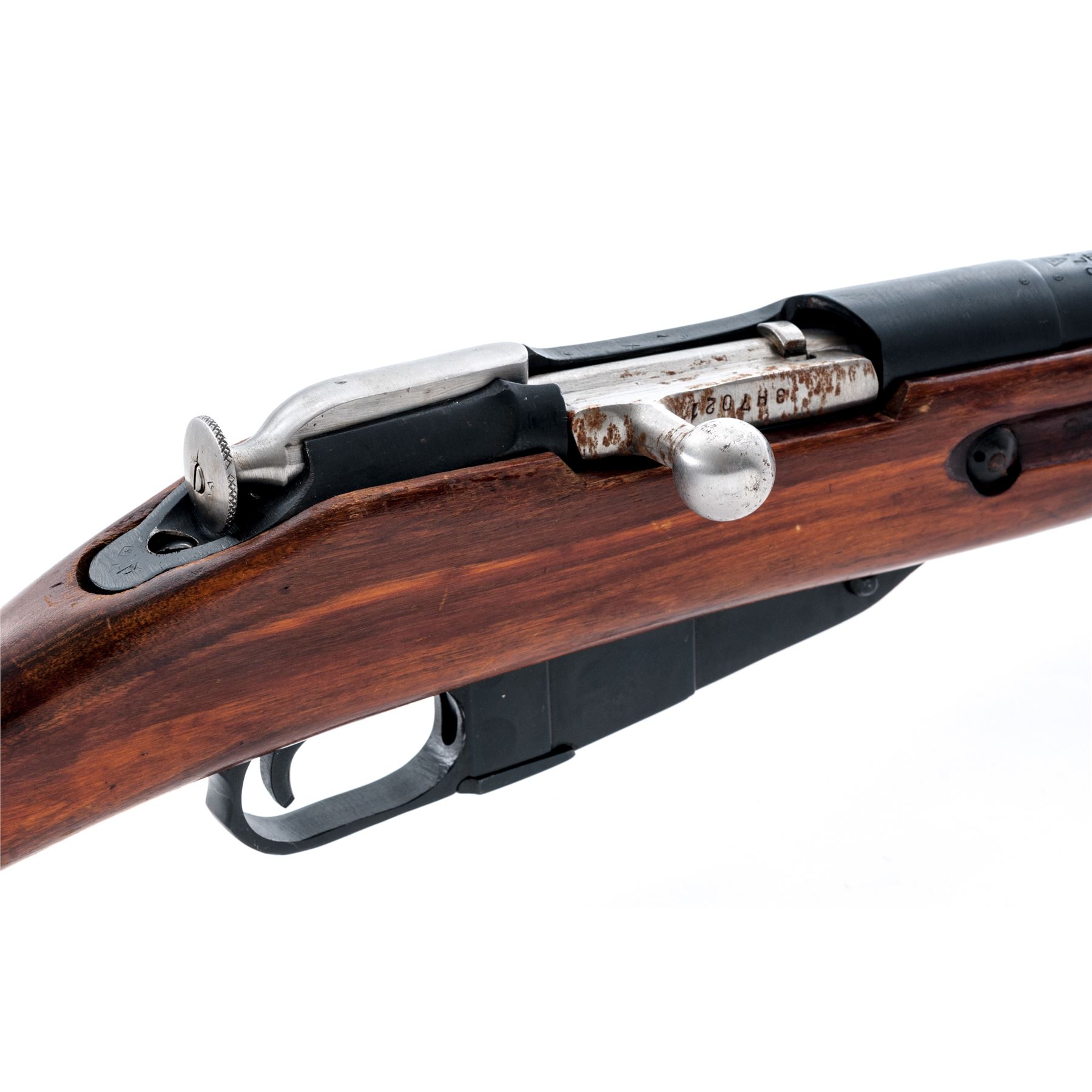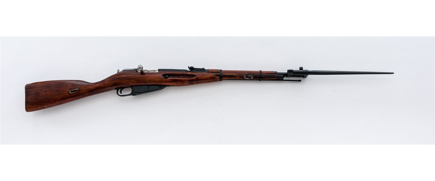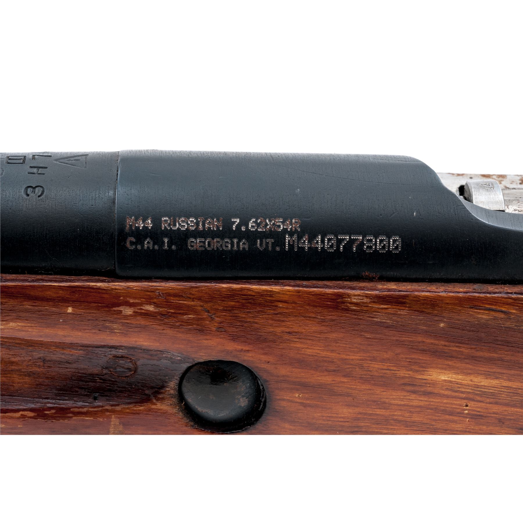 Soviet M44 Mosin-Nagant Bolt Action Rifle, with folding bayonet, #M44077800, 7.62x54R cal., 20.4'' barrel, blued finish, hardwood stock, hooded post front sight and adjustable tangent rear sight. Marked on barrel shank with Soviet crest and ''1944r'' over the triangle stamp of the Izhevsk Arsenal. Matching numbers, includes cleaning rod. Arsenal repair to stock. Condition overall is good with approx. 85% finish remaining on the metal with areas of rust on the receiver, buttplate, and bolt. Wood is very good with mostly light scratches to the shellac finish. Action is smooth, bore is poor with pitting forward of the chamber. Bayonet operates smoothly. Import stamped on left side of receiver. Est.: $250-$400. (C&R)