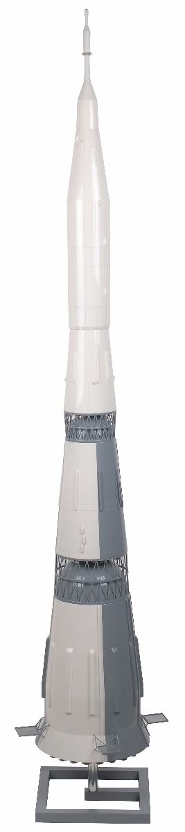 Enormous 1:72 scale model of the Soviet N1-L3 rocket, one of two examples produced by Energia Corporation, constructed of metal and resin, measuring 56? tall and 13.5? at its widest, raised slightly on a stand. In fine condition, with one tiny leg support for a fin absent and one detached but easily repairable. The USSR’s development on the N1 rocket began in 1959 with a view to delivering a payload beyond low Earth orbit. The N1-L3 was developed in direct competition to the American Saturn V and intended to carry a payload to the moon. It would carry the L3 lunar payload, consisting of an Earth departure stage and a lunar landing assist stage, in addition to a single-cosmonaut lunar lander and a two-cosmonaut lunar orbiter. Between insufficient funding and technical difficulties, the the N1 never successfully completed a test flight; all four unmanned test launches ended in failure before first-stage separation, none lasting more than two minutes. A rare, impressive model of this Soviet rocket.