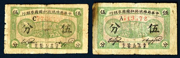 China. Lot of 2 notes, Both 5 Cents, Black text on green underprint with men marching with flag in middle and back purple, Choice VG to Fine.