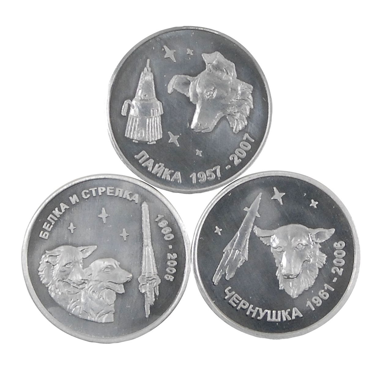 Three aluminum commemorative coins, all approximately 1.25? in diameter, issued between 2005 and 2007, each honoring a different unmanned Sputnik mission and its canine passenger. Coins are from Sputnik 2 (Laika), Sputnik 5 (Belka and Strelka), and Sputnik 9 (Chernushka). All three were issued by the Samara Industrial Complex, makers of the Soyuz spacecrafts, and are made from metal that was flown in space.