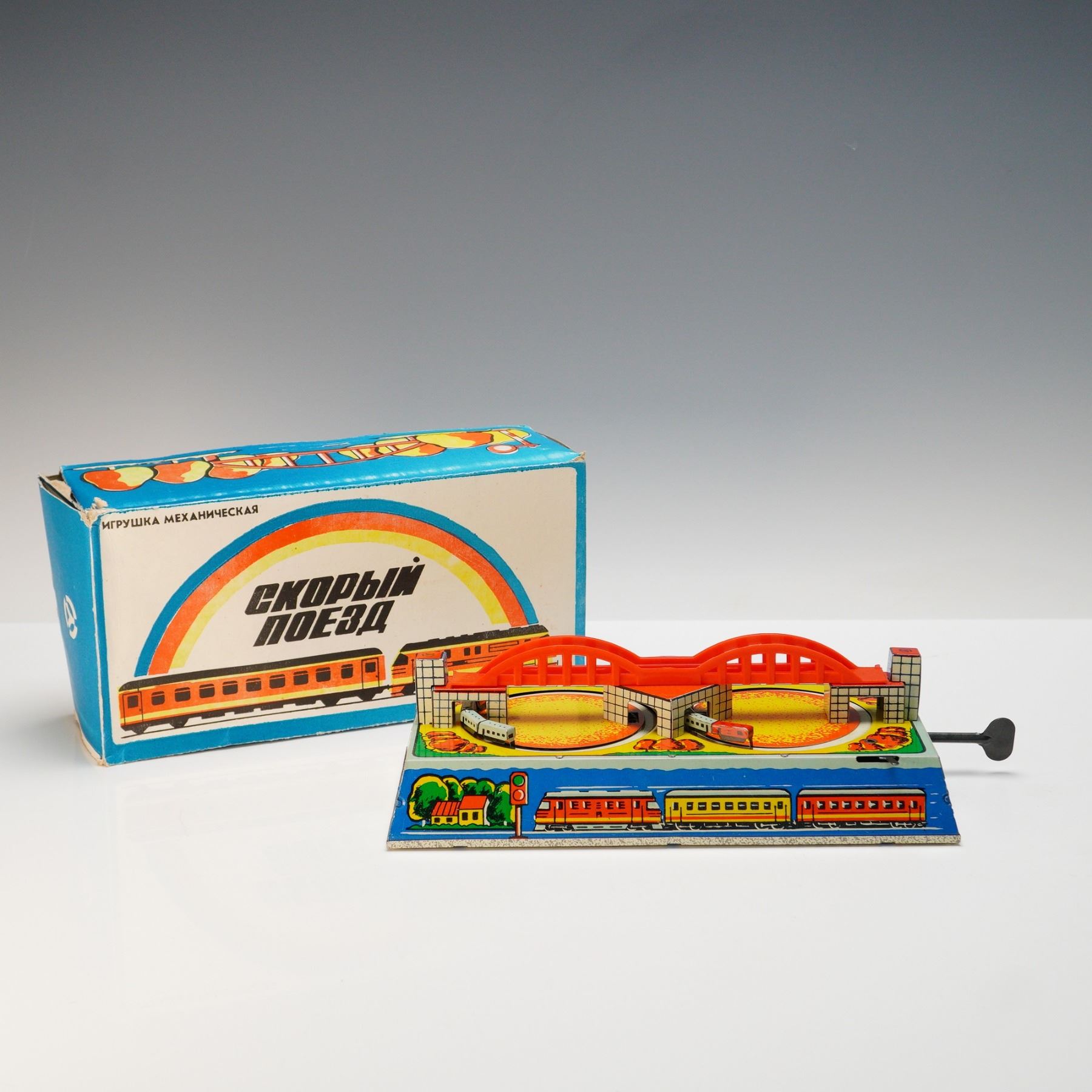 A vintage Soviet tin mechanical toy from the Igrotechnika factory in Leningrad, titled "Skoryi Poezd" (translation: Express Train). The colorful lithographed tinplate design features a bright orange bridge, circular tracks, and a wind-up train operated by the included metal key. The original box is present with printed instructions in Russian advising to turn the key clockwise only and not to overwind the spring. This toy reflects the USSR focus on progress and technology, with trains symbolizing speed and modernity. Rarely found complete with both box and key, this example is a desirable collectible of mid-20th century Soviet memorabilia.