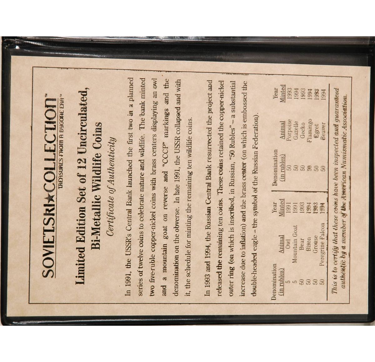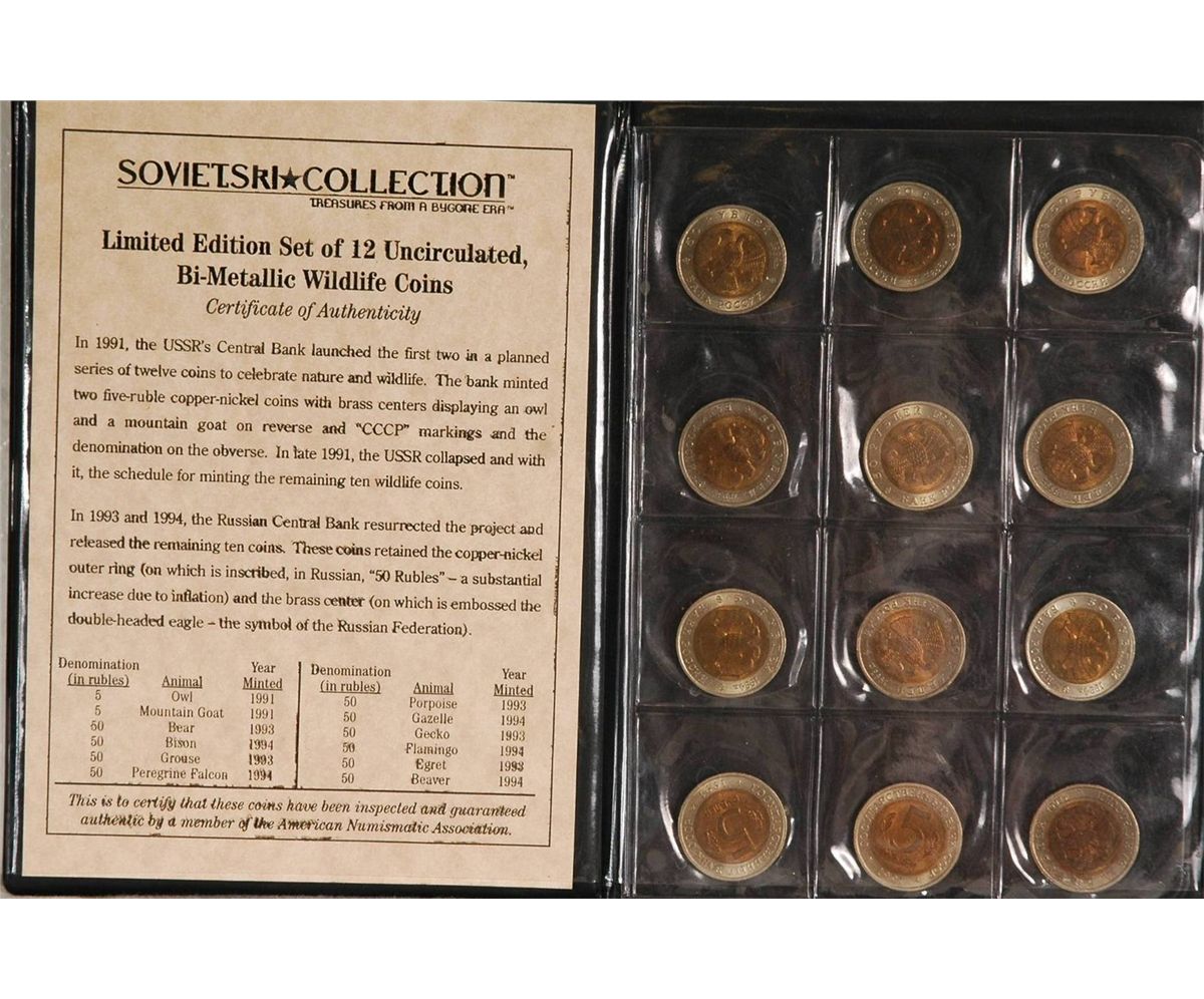 12 copper, nickel and brass coins, limited edition collection minted by the USSR in 1993-4. In plastic collectors case. 7.5'' x 5.5".