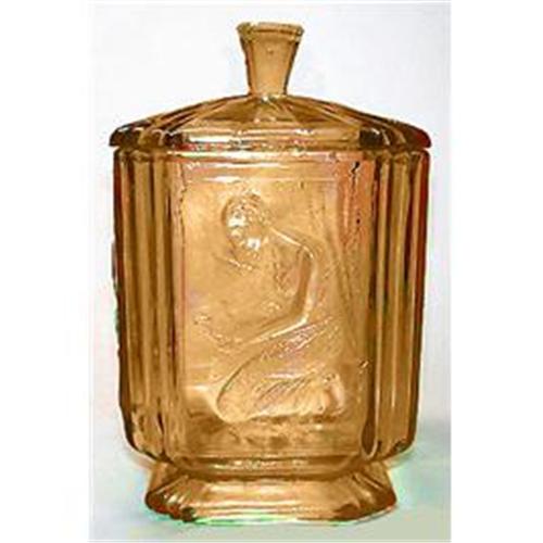 From the Sowerby Glassworks of Gateshead, Northern England this outstanding pressed glass footed dresser jar, known as PANDORA, depicts a kneeling lady on all four sides. Classic Art Deco shape produced in lovely amber Depression glass and measuring 5 1/4 x 5 1/4 x 8 inches tall. This wonderful Art Deco dresser jar and its lid are both in excellent condition