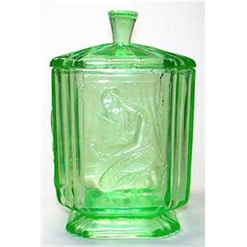 From the Sowerby Glassworks of Gateshead, Northern England this outstanding pressed glass footed dresser jar, known as PANDORA, depicts a kneeling lady on all four sides. Classic Art Deco shape produced in lovely green Depression glass and measuring 5 1/4 x 5 1/4 x 8 inches tall. With the exception of a slight sliver of glass missing from underneath the lid this wonderful Deco dresser jar and its lid are both in excellent condition