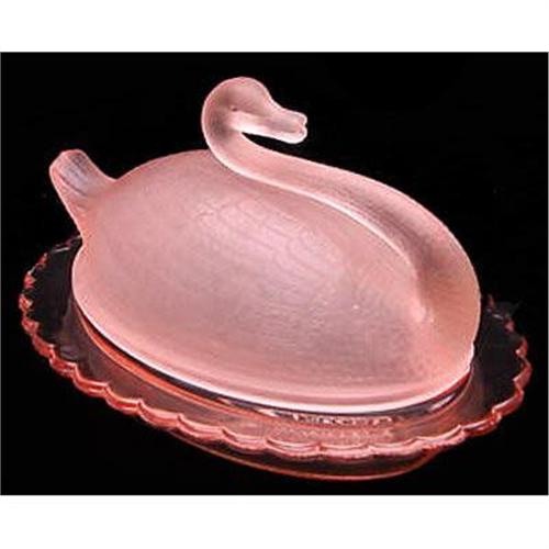 Produced in England by the SOWERBY GLASSWORKS, in pink satin and transparent glass. This exceptionally detailed Art Nouveau SWAN figural butter dish, known as the Rosalin Swan, was first introduced circa 1880 and remained in production until 1920. These early examples differ from those produced post 1920 as the gap between its lower neck and body was not filled in. Measuring 8 inches long by 5 1/2 inches deep x 5 inches tall. It is hard to find this intricately designed Swan figural butter dish with the delicate gap between the elegant neck and body intact. Both the swan lid and base are in excellent condition for its age.